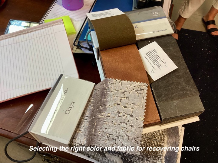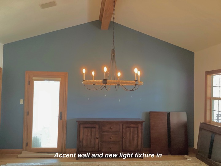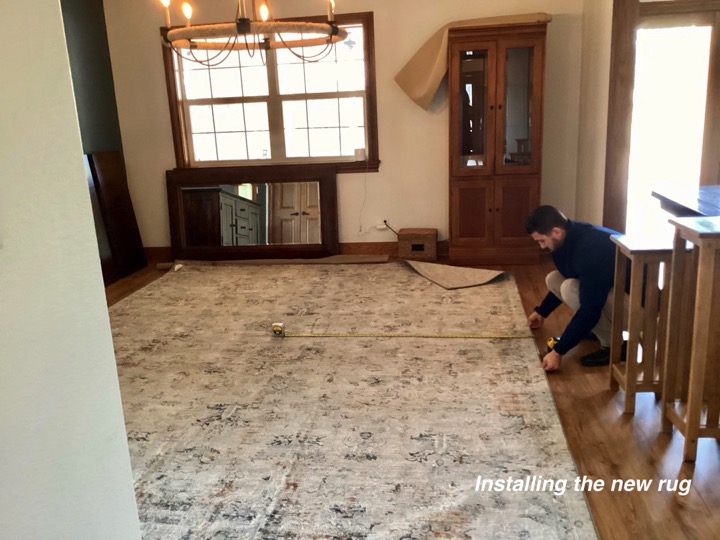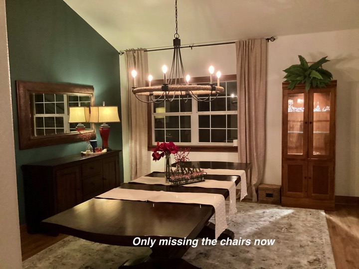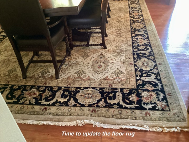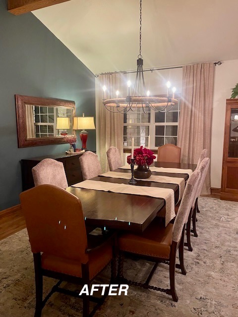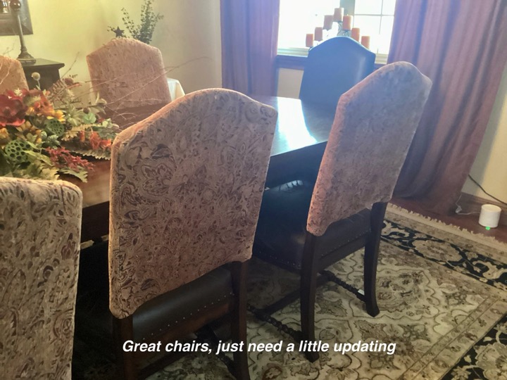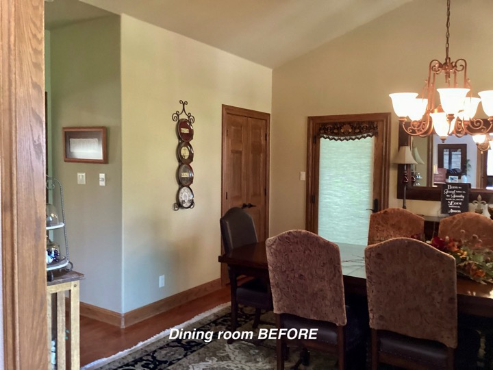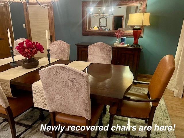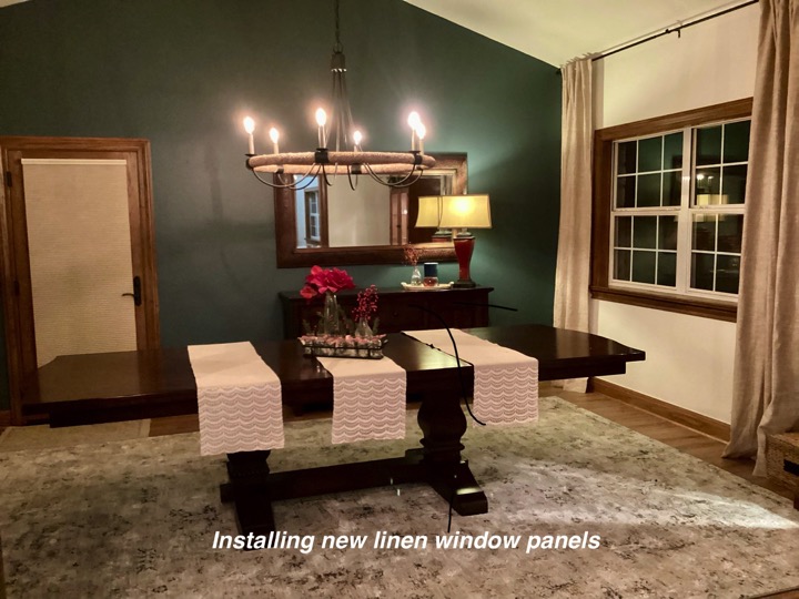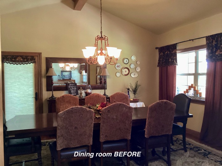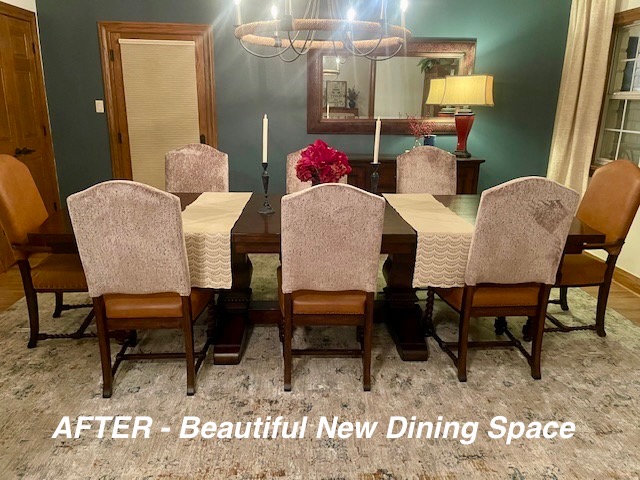 When someone does a major remodel on a room in their home, such as a kitchen, the room or rooms within sight will most likely need a little refresh. As was the case in this home. So after the new flooring-we painted the walls, updated the floor rug, reupholstered the chairs, changed window treatments and hung them properly, repositioned the wall mirror, updated the light fixture and wow — Stunning new dining to go with the amazing new kitchen!