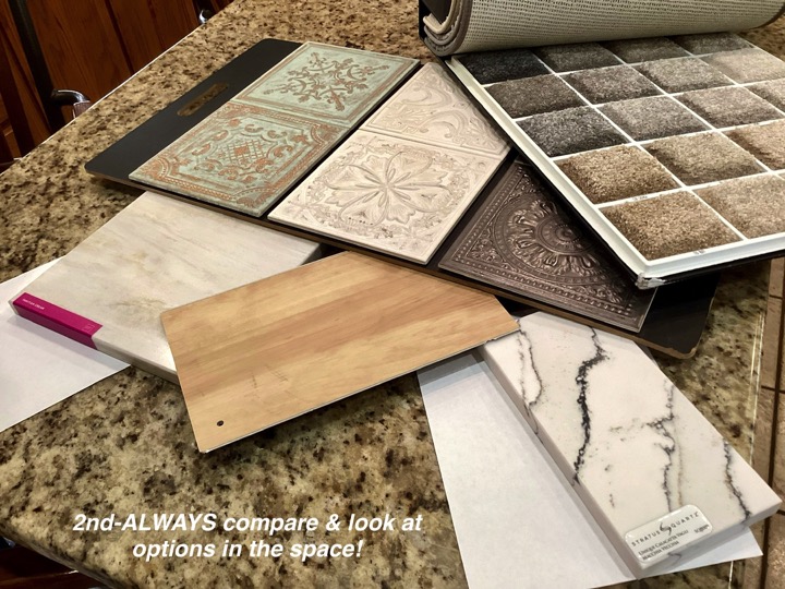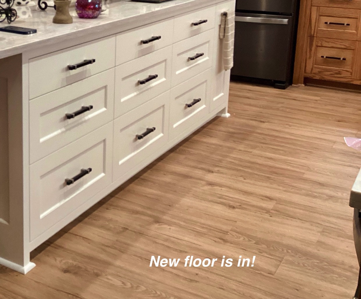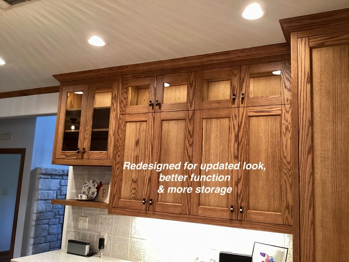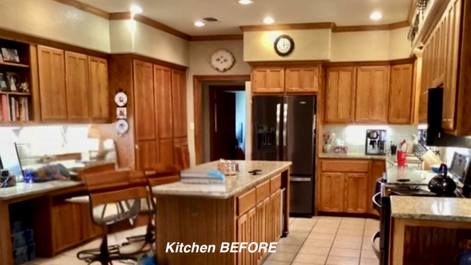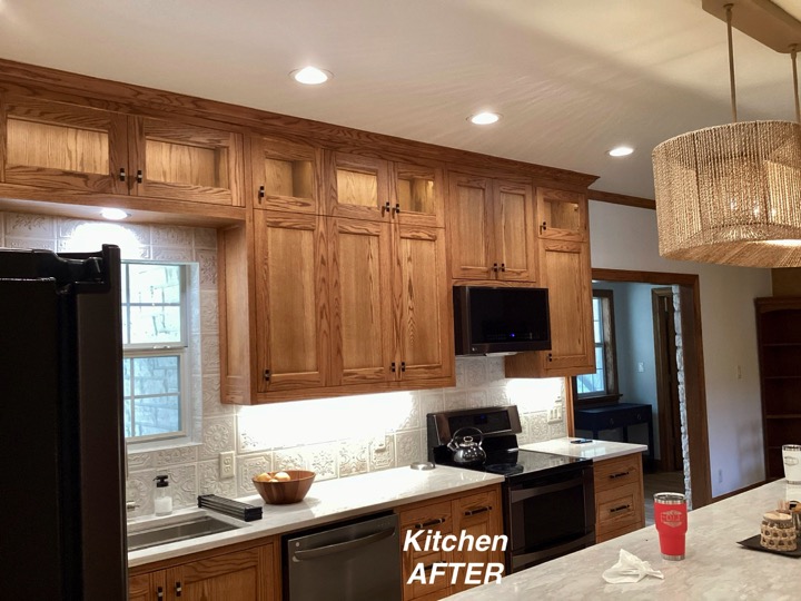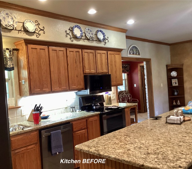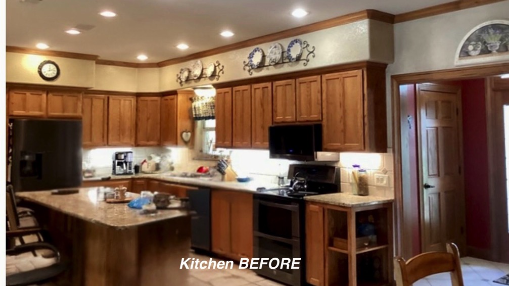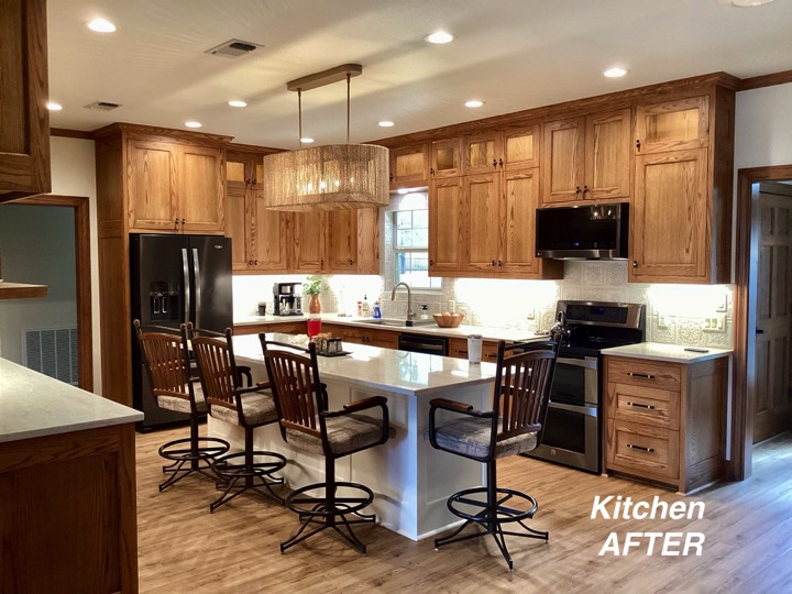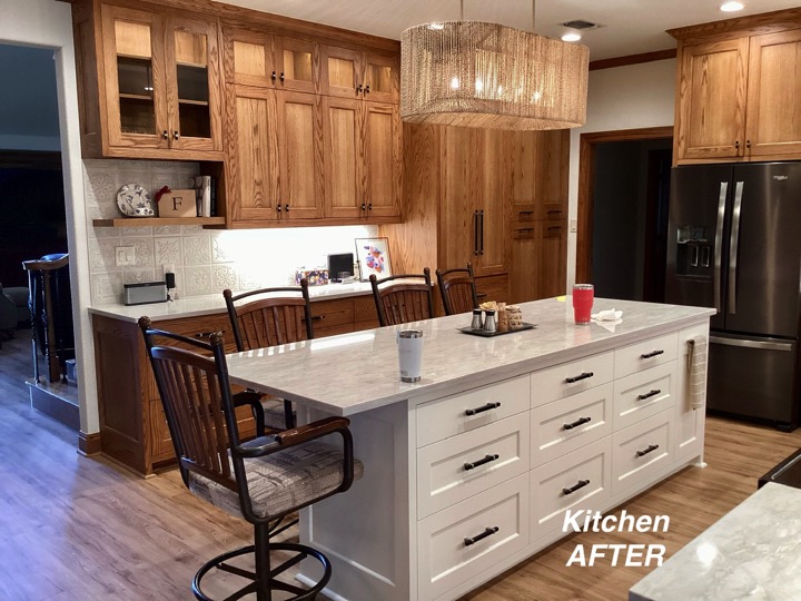 One of my first recommendations for this kitchen update was to remove the soffit, which the homeowner had not considered. So the cabinets were redesigned to give her much more function and space, including removing the soffits and unused desk area. The oak trim was throughout the home so we kept the stained oak color but gave it a beautiful updated look with the trim. We also broke up all the warm tones by painting the kitchen island and adding light colored Quartz and timeless backsplash. The LVP flooring was chosen carefully to play nice with the Oak and it came together just divine!!