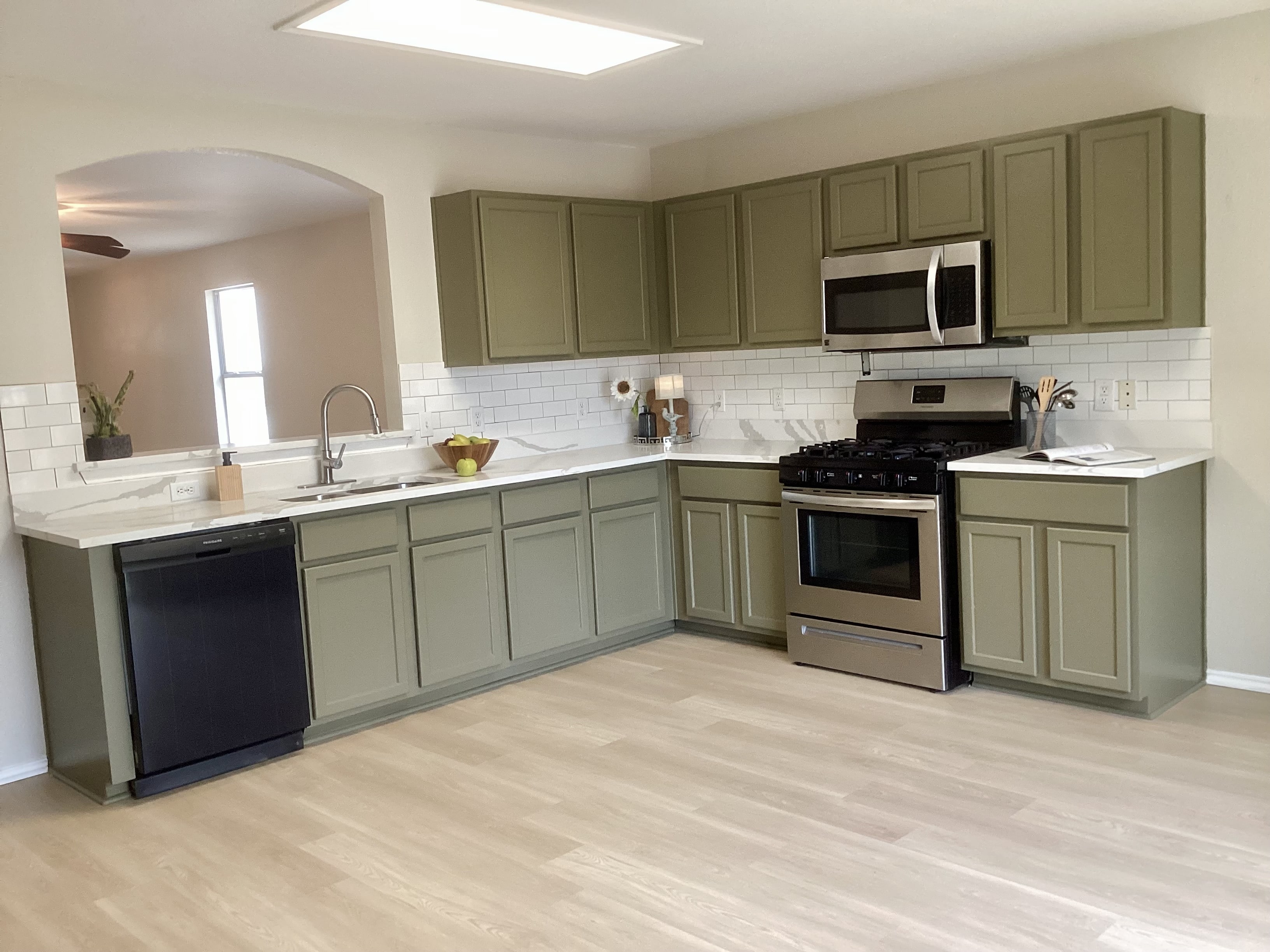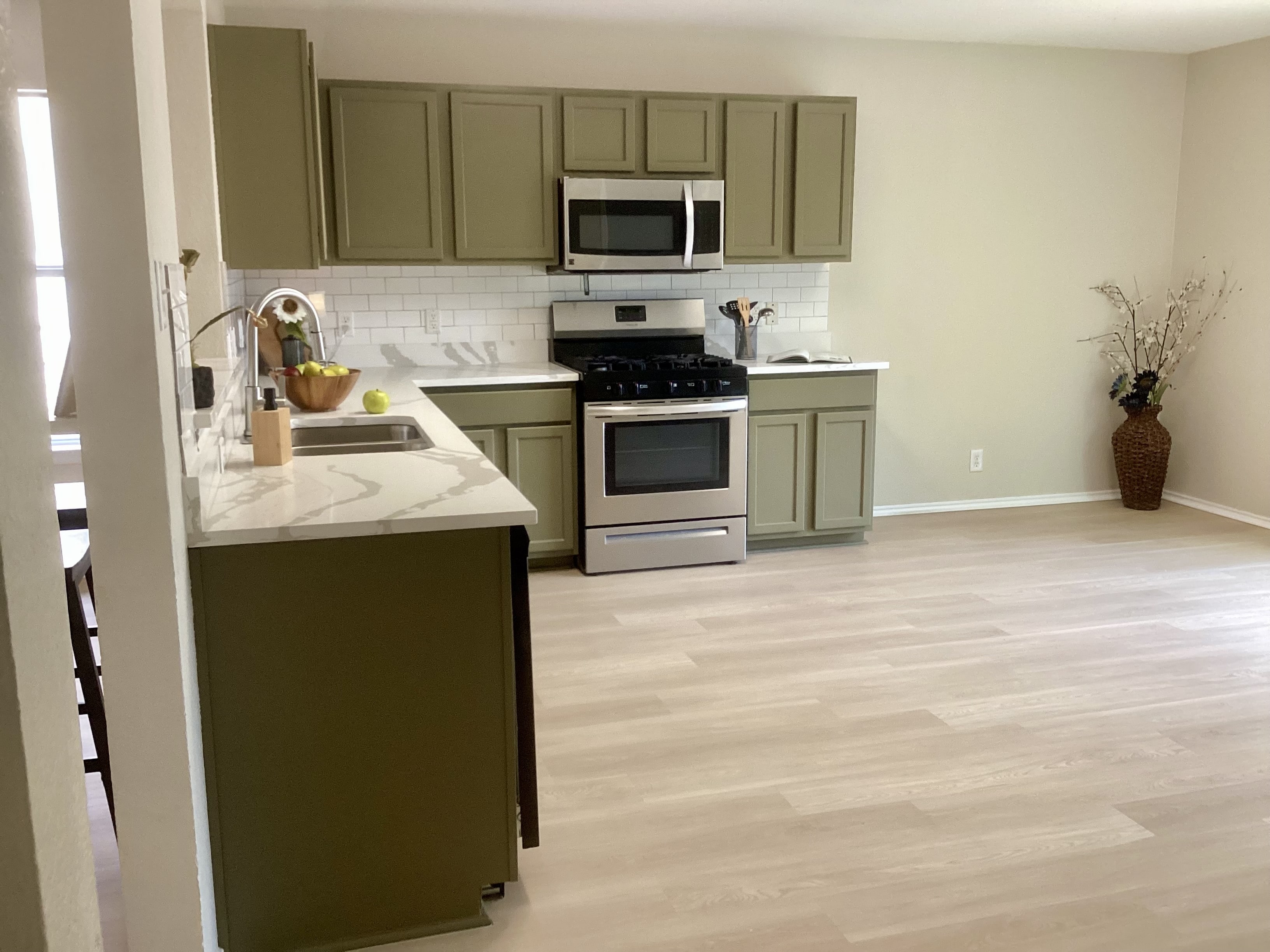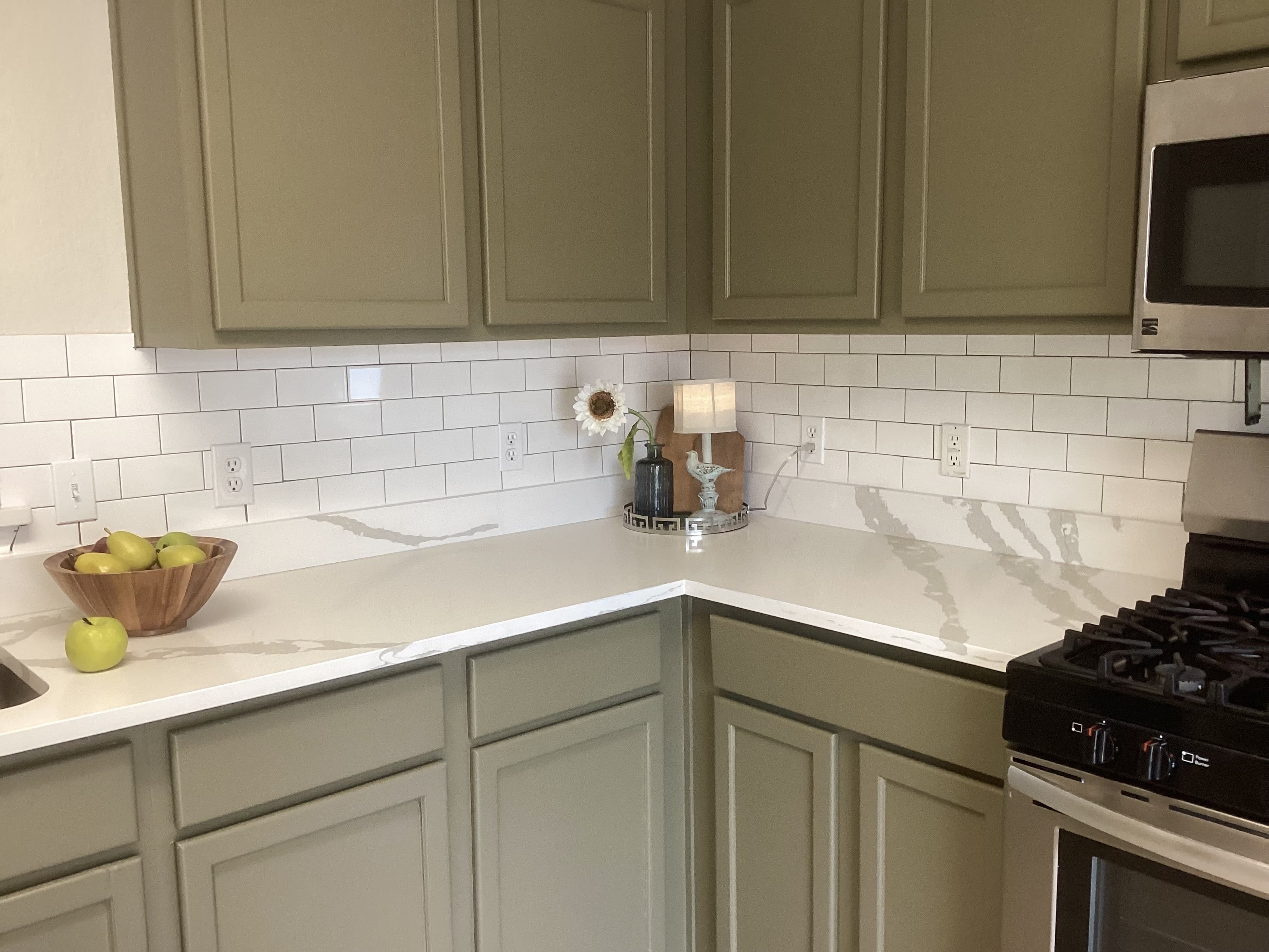 After considering all those aspects, and current colors & finishes; I recommended this beautiful and trendy green hue, which gave it that wow factor to stand head and shoulders above the others, update the look of the cabinets and of course, look great with the other elements in the home. The countertop was selected specifically to complement the cabinet color and work well with the backsplash.