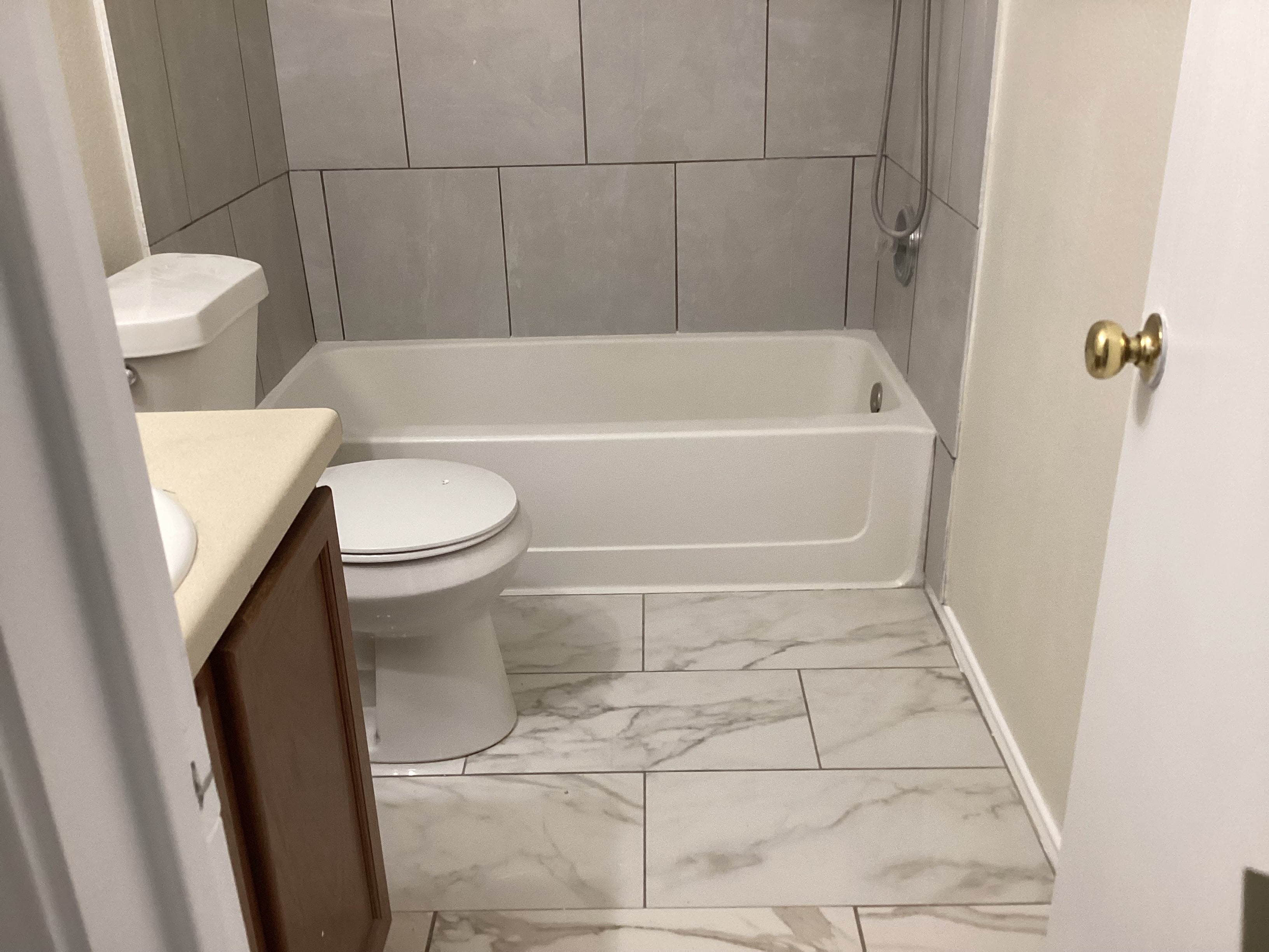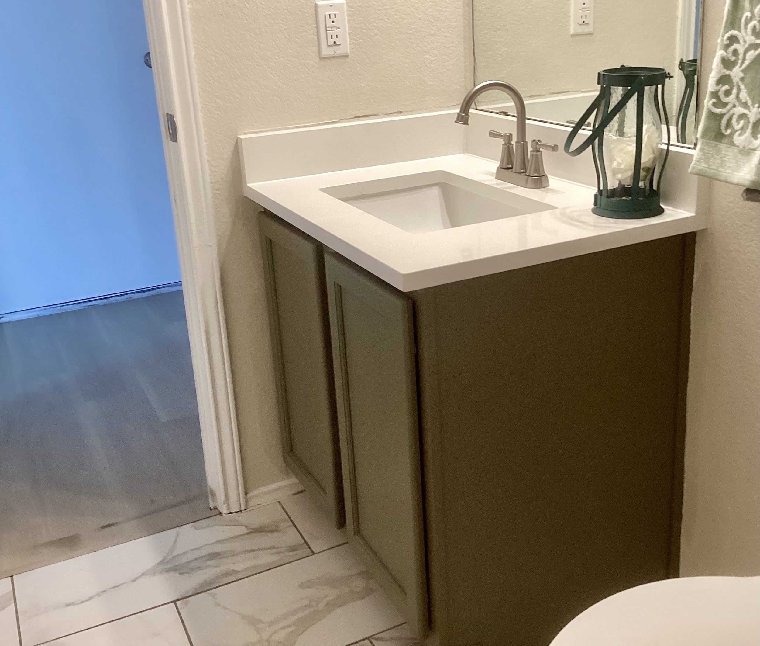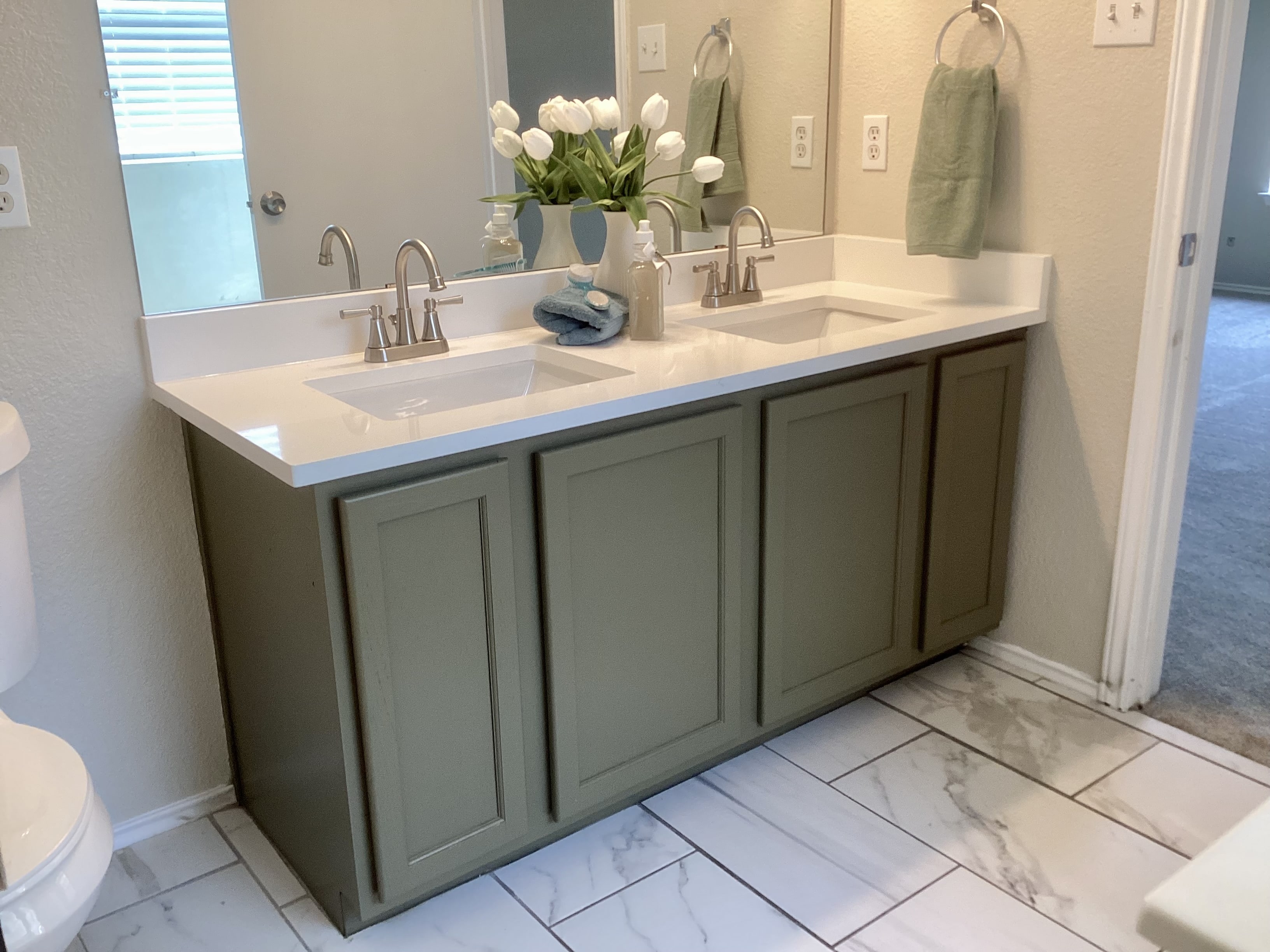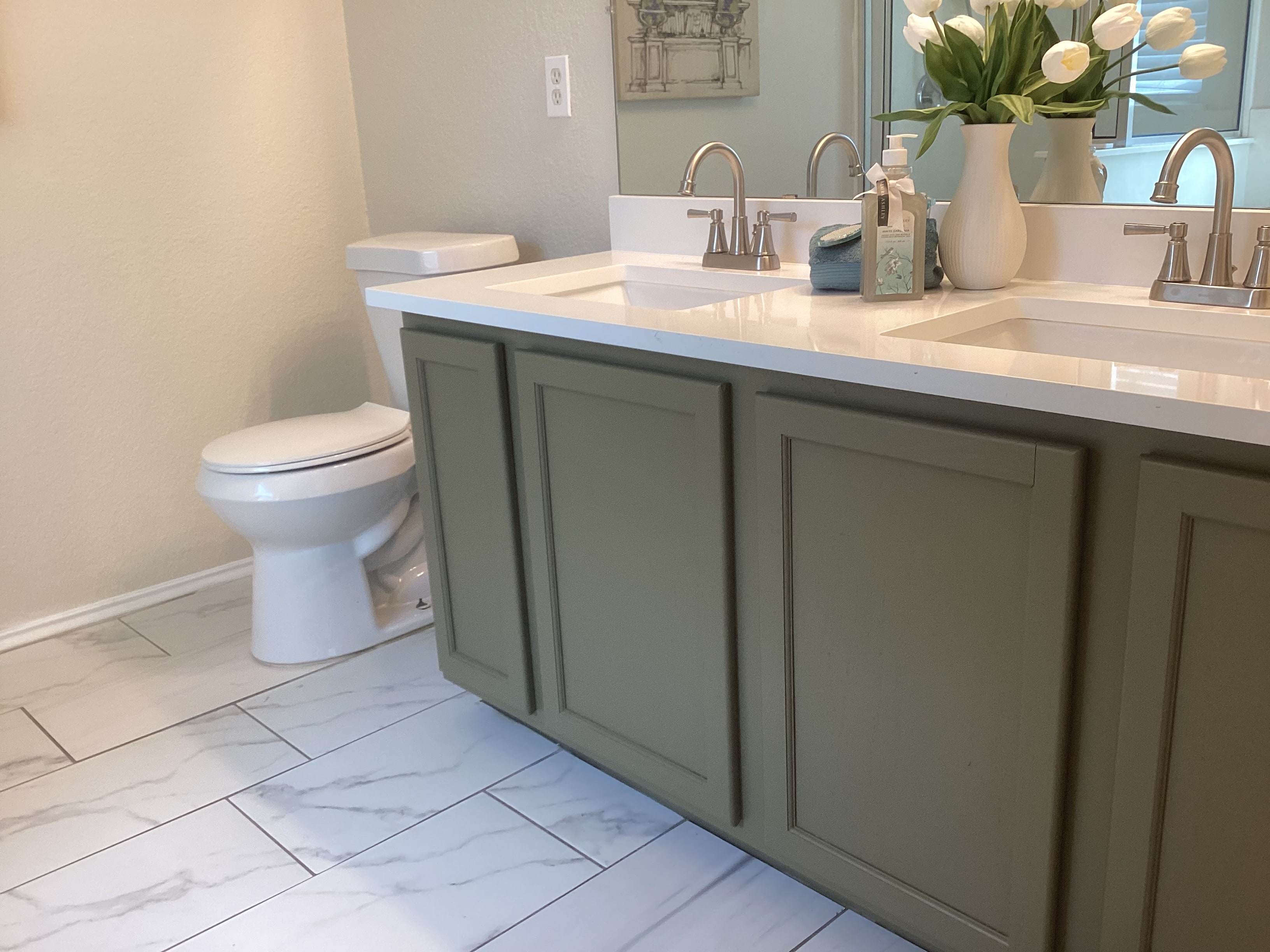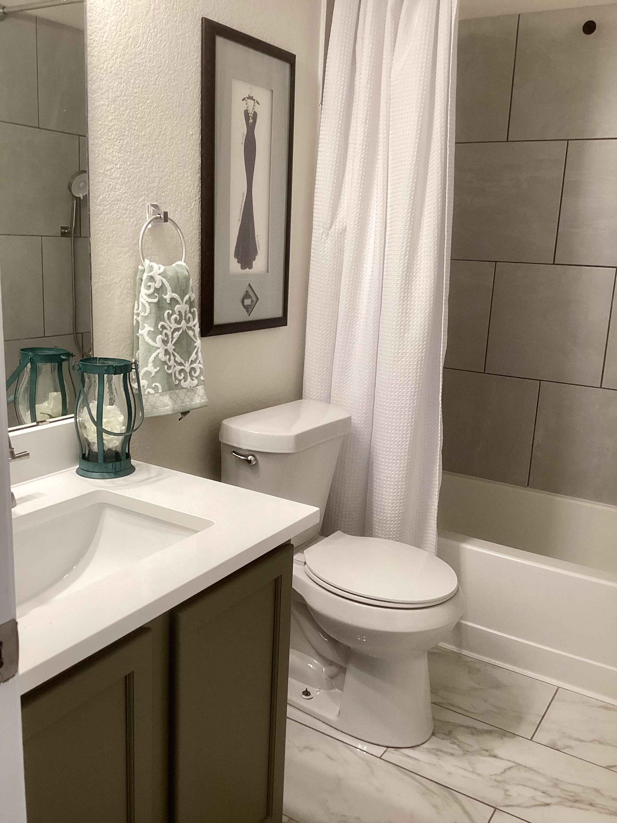 The guest bath had the same newer looking floor but it also had gray wall tiles around the tub/shower. So our beautiful green cabinet color and solid off white quartz countertop worked perfectly and finished off this entire room update.
