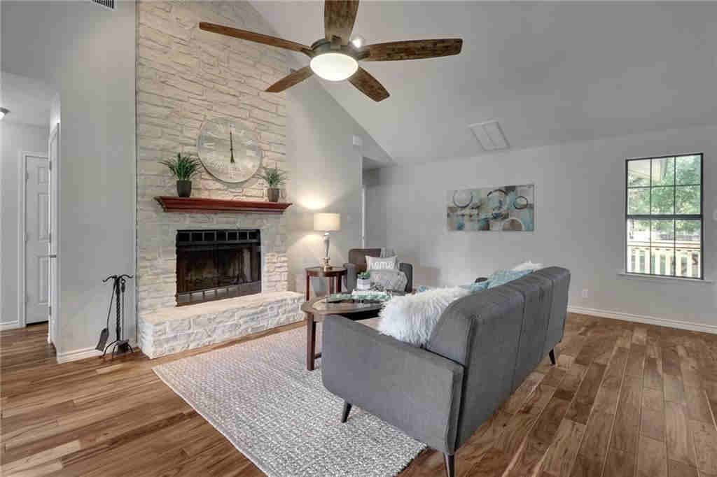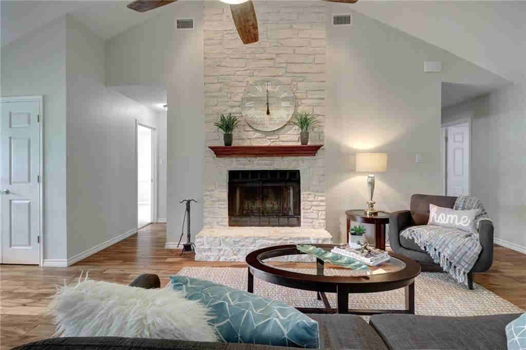 - AFTER staging – exterior color is repeated in interior for a nice flow
